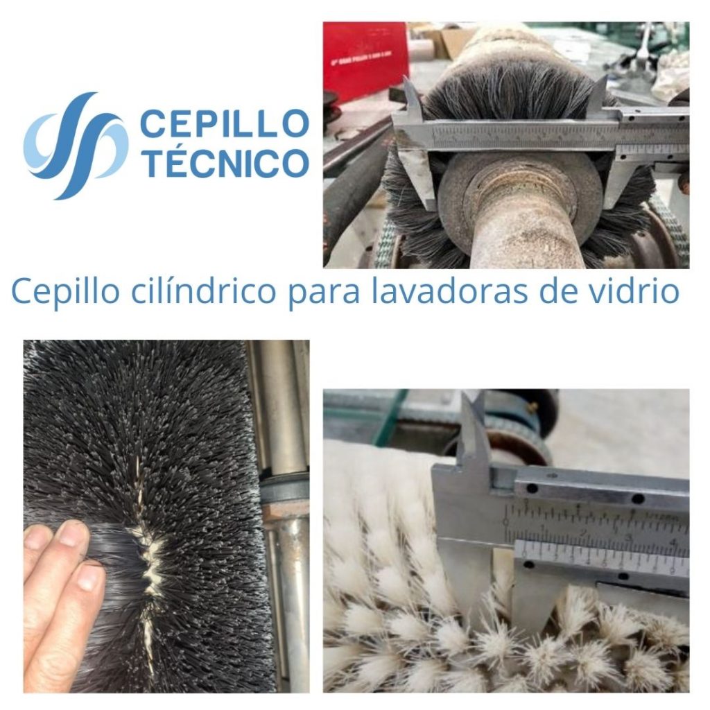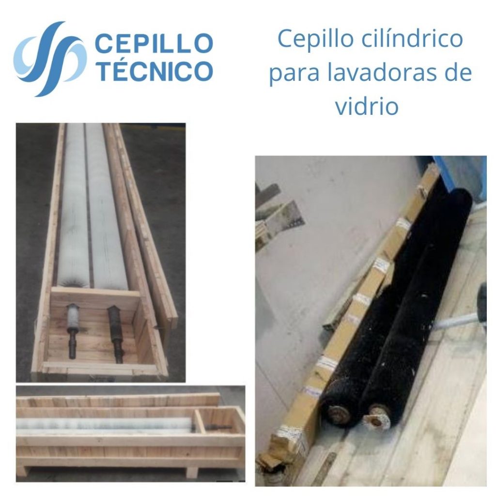 Estos cepillos industriales son rodillos, cilindros con fibra sintética que suele ser poliamida (nylon) para no dañar o rayar el vidrio. Suelen ser cepillos cilíndricos muy largos, compuestos de varios módulos y bastante densos de fibra para realizar una limpieza óptima. Además cada máquina contiene varios ejes con cepillos montados a lo largo.
