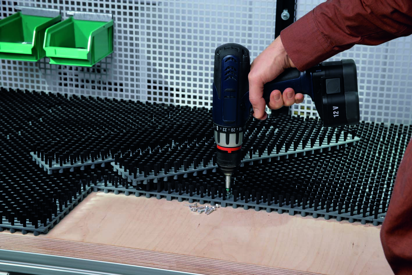 Fijación de piezas y componentes. La fijación/aseguramiento es más común en la industria de la madera y el mueble. Las piezas y los componentes se sujetan entre cepillos para proteger el material y garantizar que se puedan sujetar o fijar correctamente las piezas.