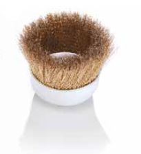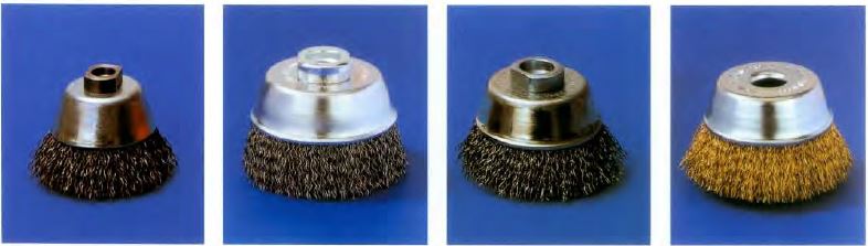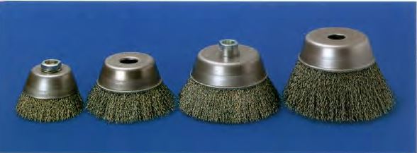 They are used to deburr surfaces, mainly in machining centers. Brushes are available with steel wire, stainless steel wire, abrasive nylon, or any other filament. Due to the straight cup, the brush filament flares less and more conical points of the bristles work on the surface.