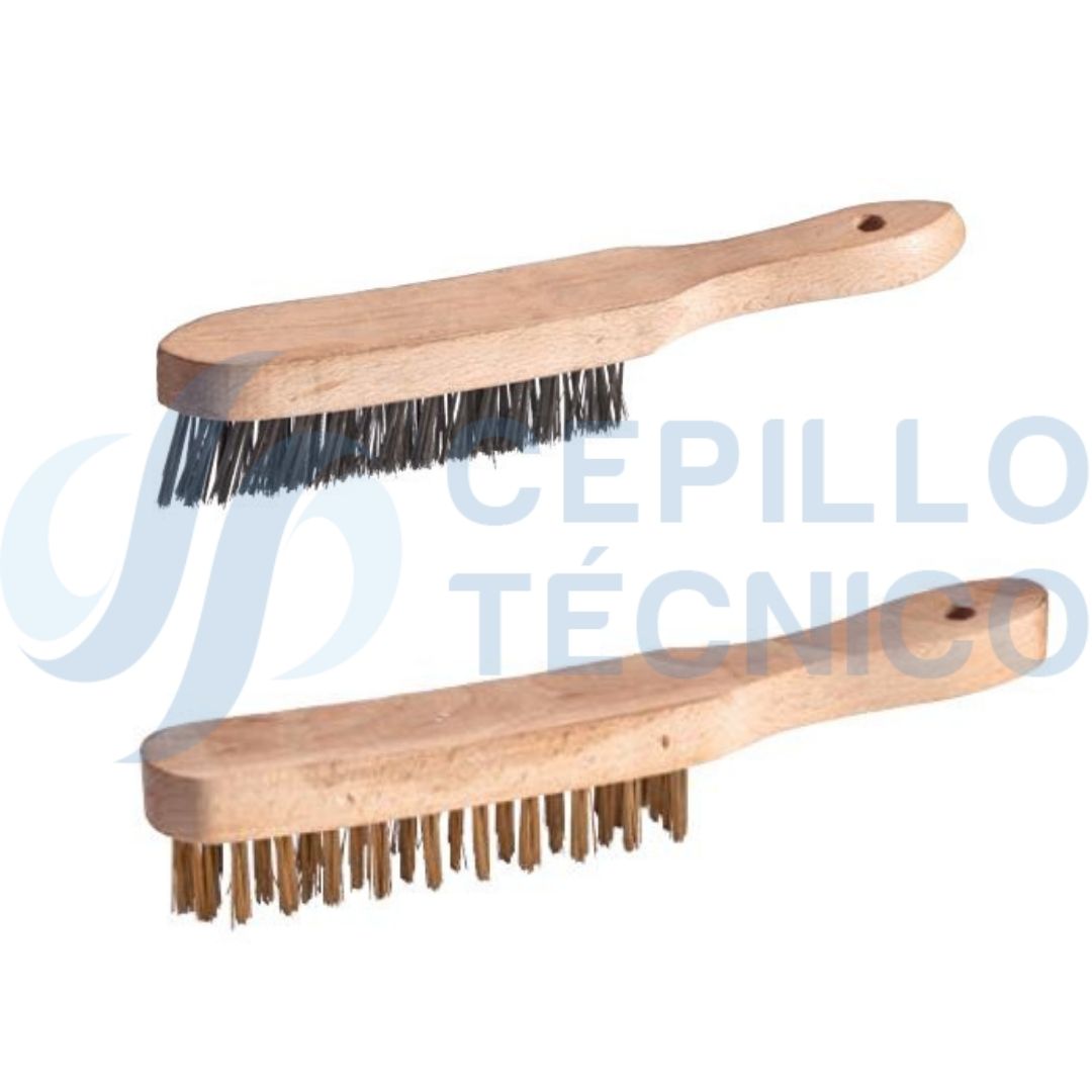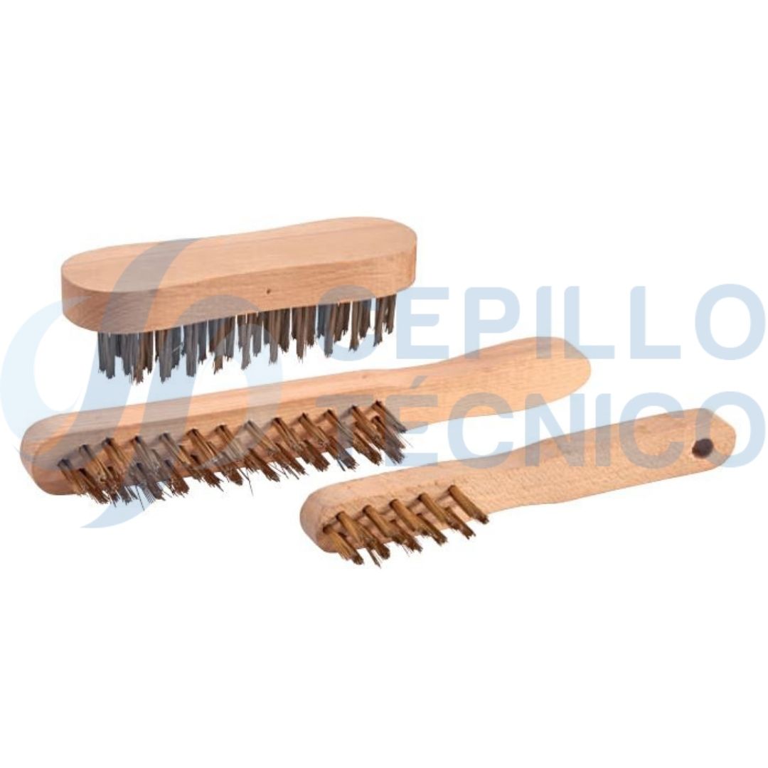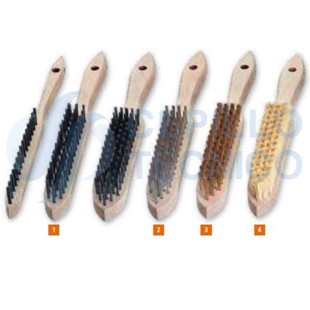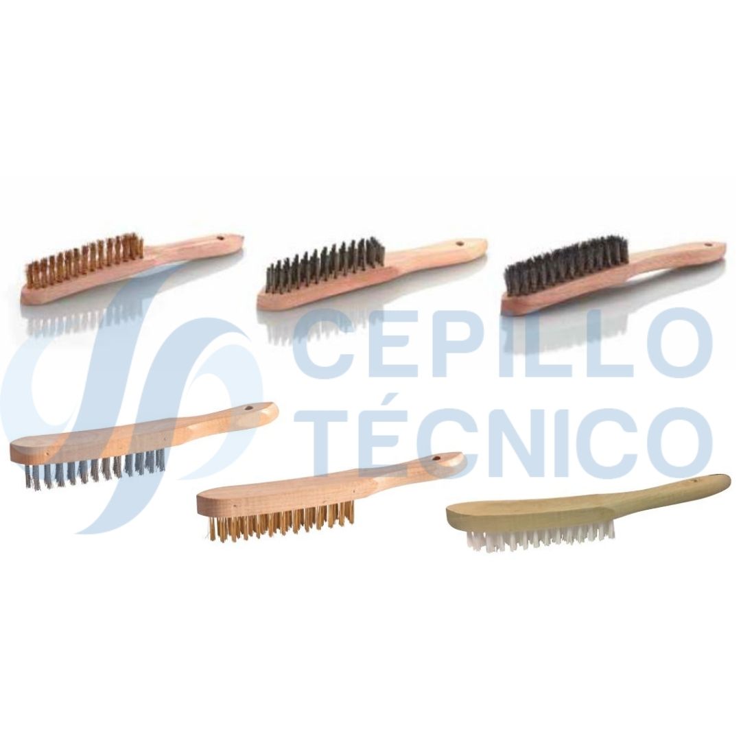 Industrial standard welder-type manual brushes with wooden handles available in different types of fiber; steel, stainless steel, brass, fronce, polyamide and tampico.