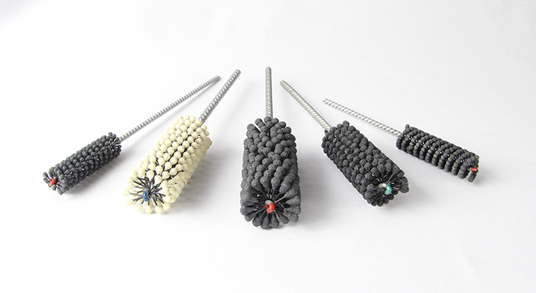 En las puntas de las cerdas llevan bolas abrasivas irrompibles que contienen carburo de silicio con granos 120, 180, 240 y 320 según modelo.
