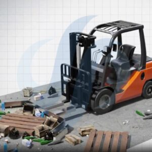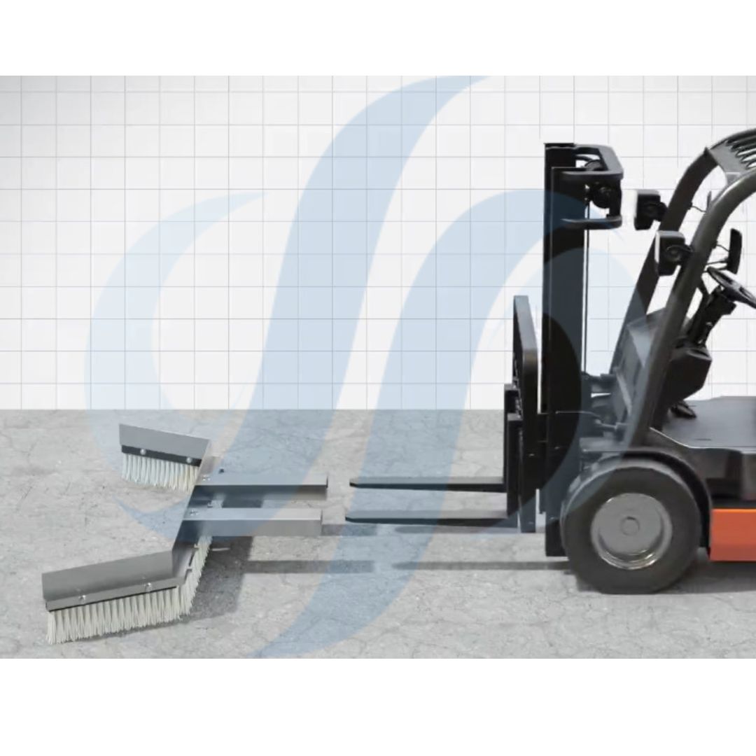Cepillos empujadores insertados sobre una estructura metálica de acero inoxidable preparada para insertarse en las horquillas de las carretillas elevadoras, también para tractores, telescópicas, palas cargadoras o minipalas.