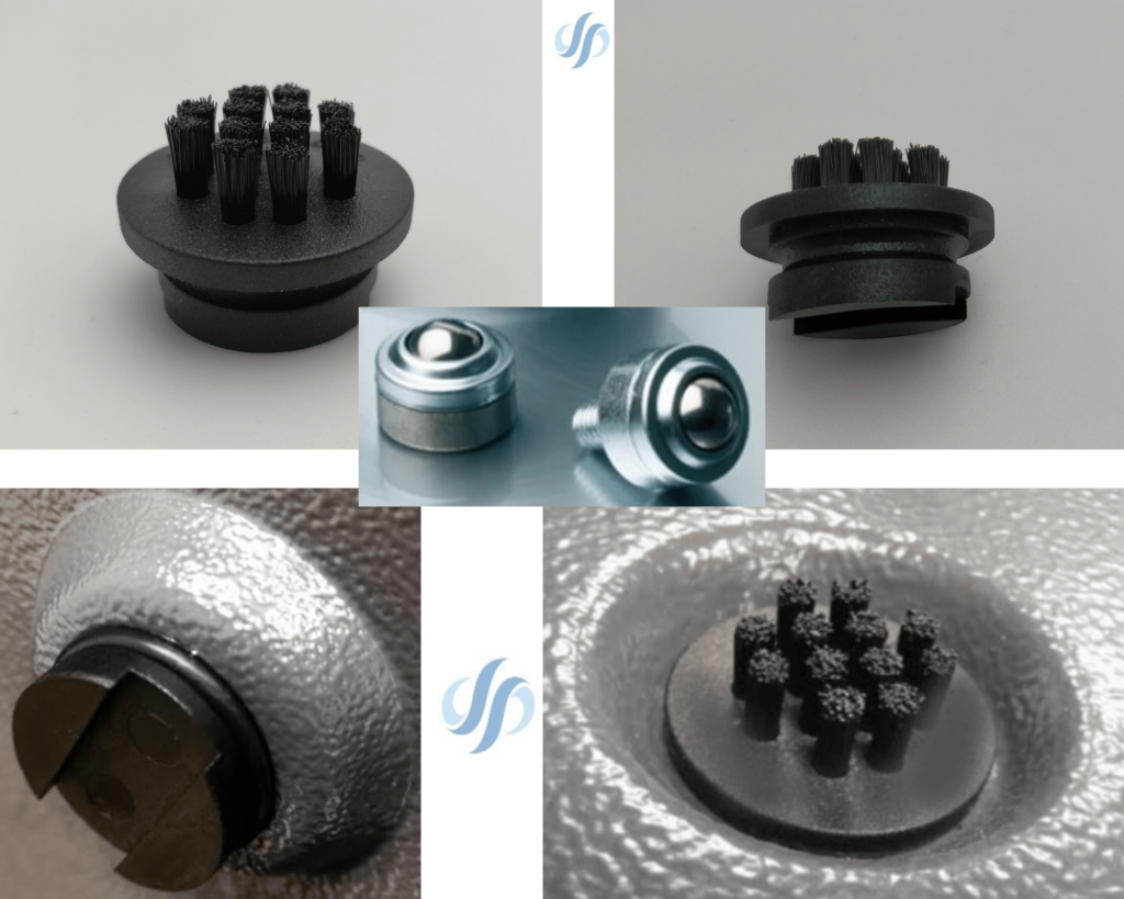 Un ejemplo claro de mejora son los cepillos de protección para máquinas plegadoras, paneladoras y punzonadoras de chapa: Las bolas transportadoras están compuestas de una bola de precisión de gran tamaño que rueda encima de un gran número de bolas de diámetro pequeño, todas ellas dentro de una caja semiesférica de acero templado.